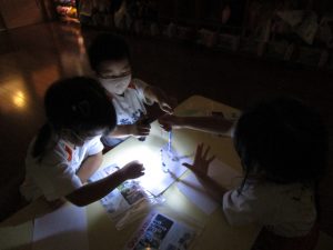 次は、クリスタルボールにビーズを紐通しし、懐中電灯で、もう一度照らしてみることに!すると、、、