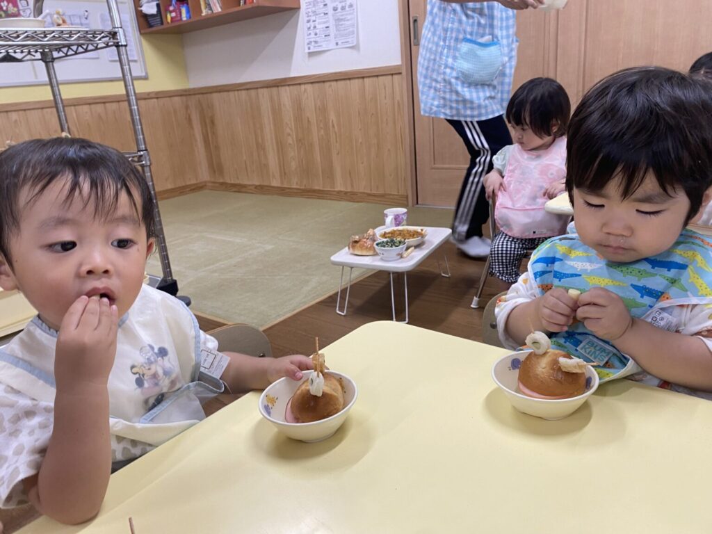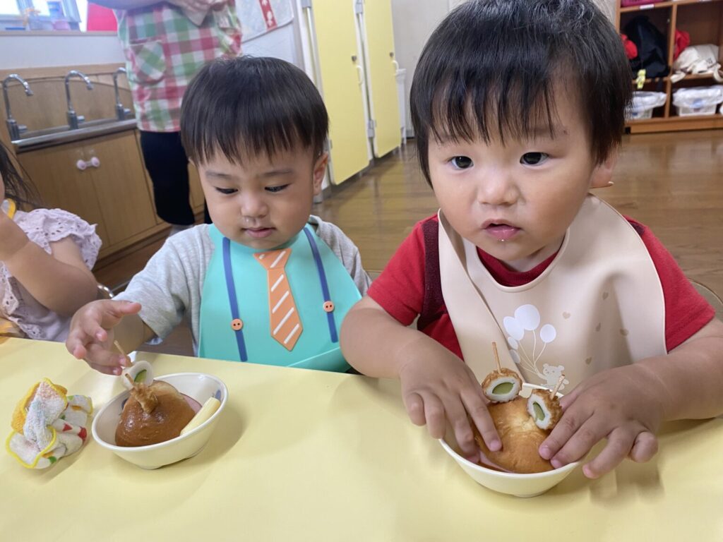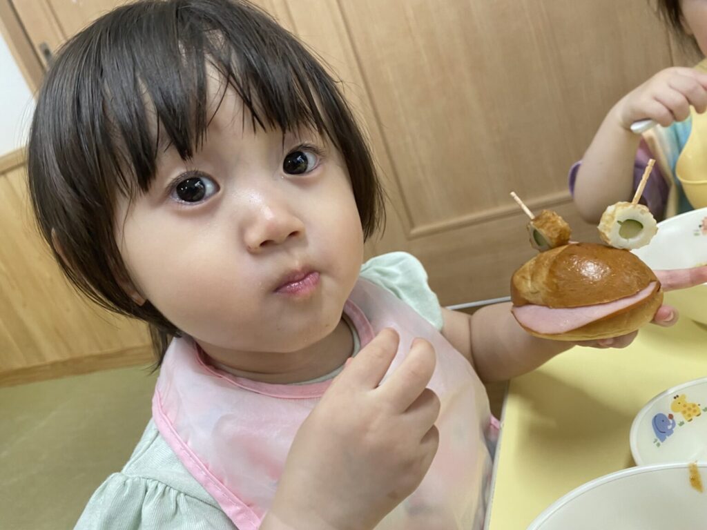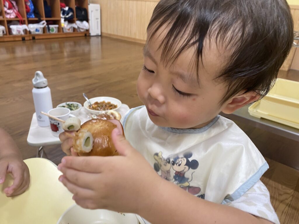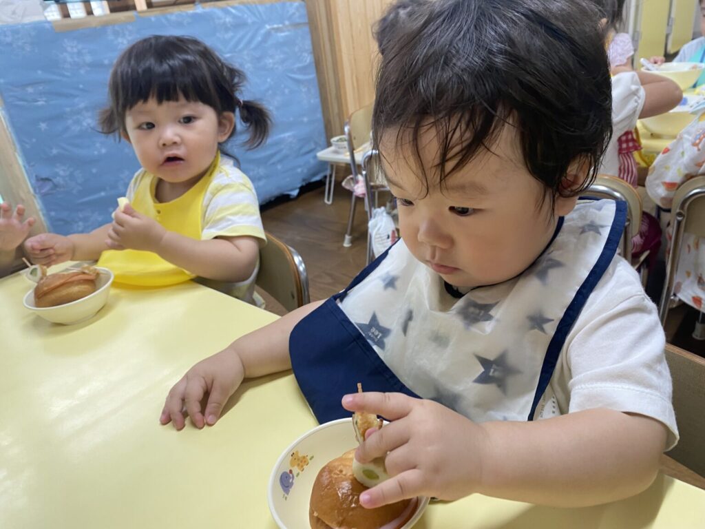 配られたパンを見ながら不思議そうに見る子どもたち(●^o^●)