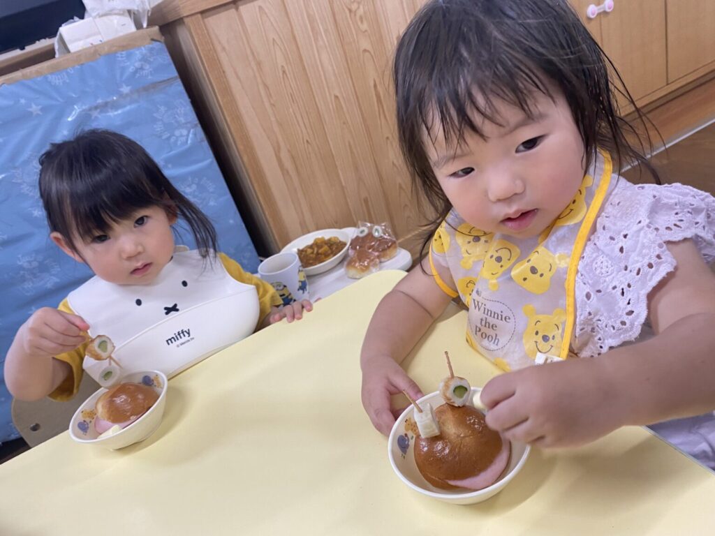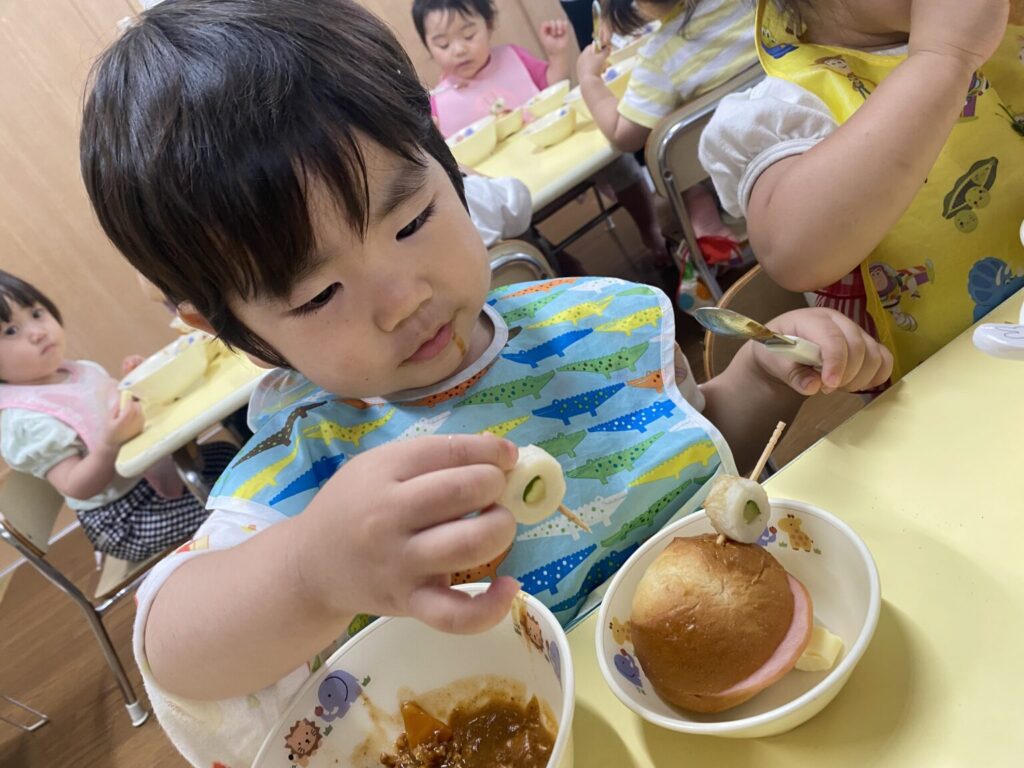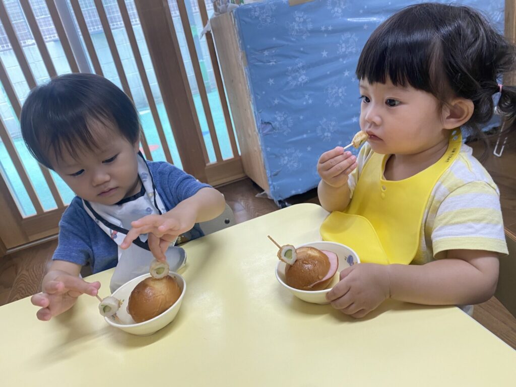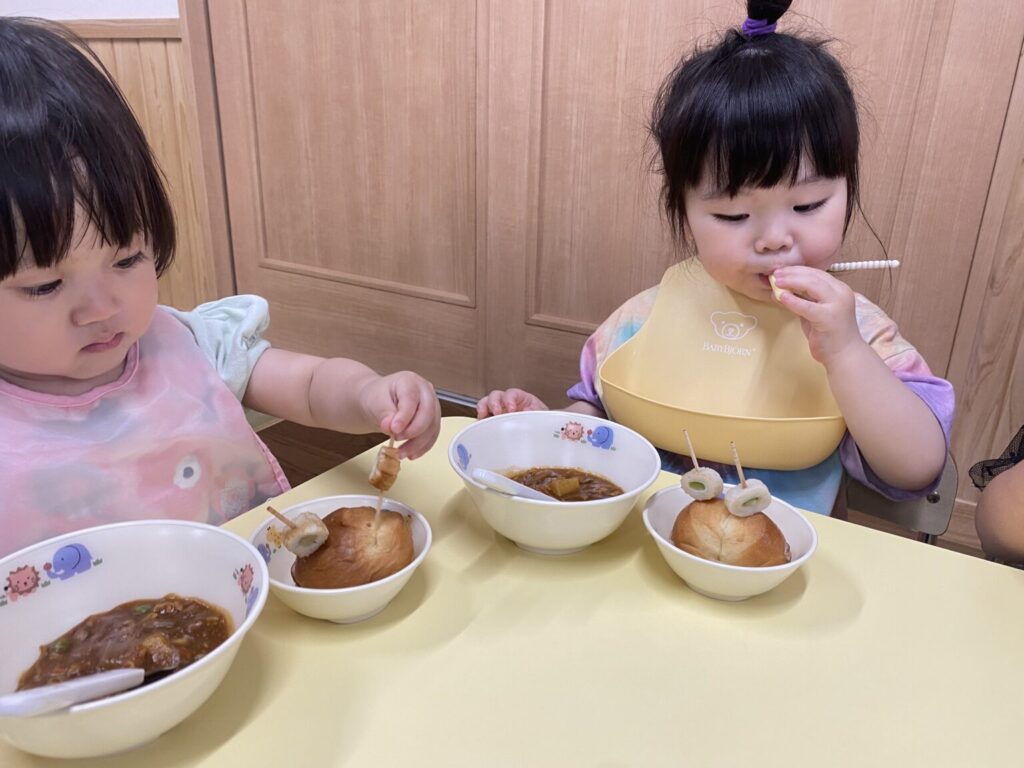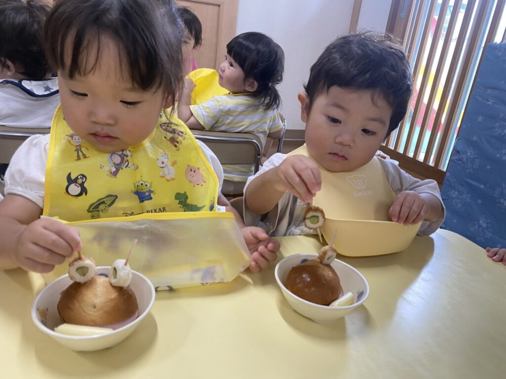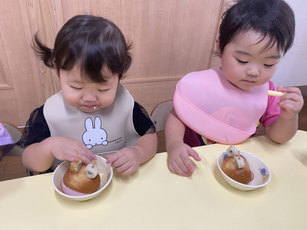配られたパンを見ながら不思議そうに見る子どもたち(●^o^●)