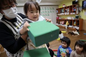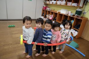 また列車ごっこでは、バスにのってを歌いながら遊んでいました。『ゴーゴー』のところでは手を挙げながら進んでいました。