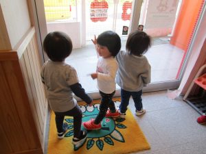 めいちゃんに「いってきまーす!!」と挨拶して靴を